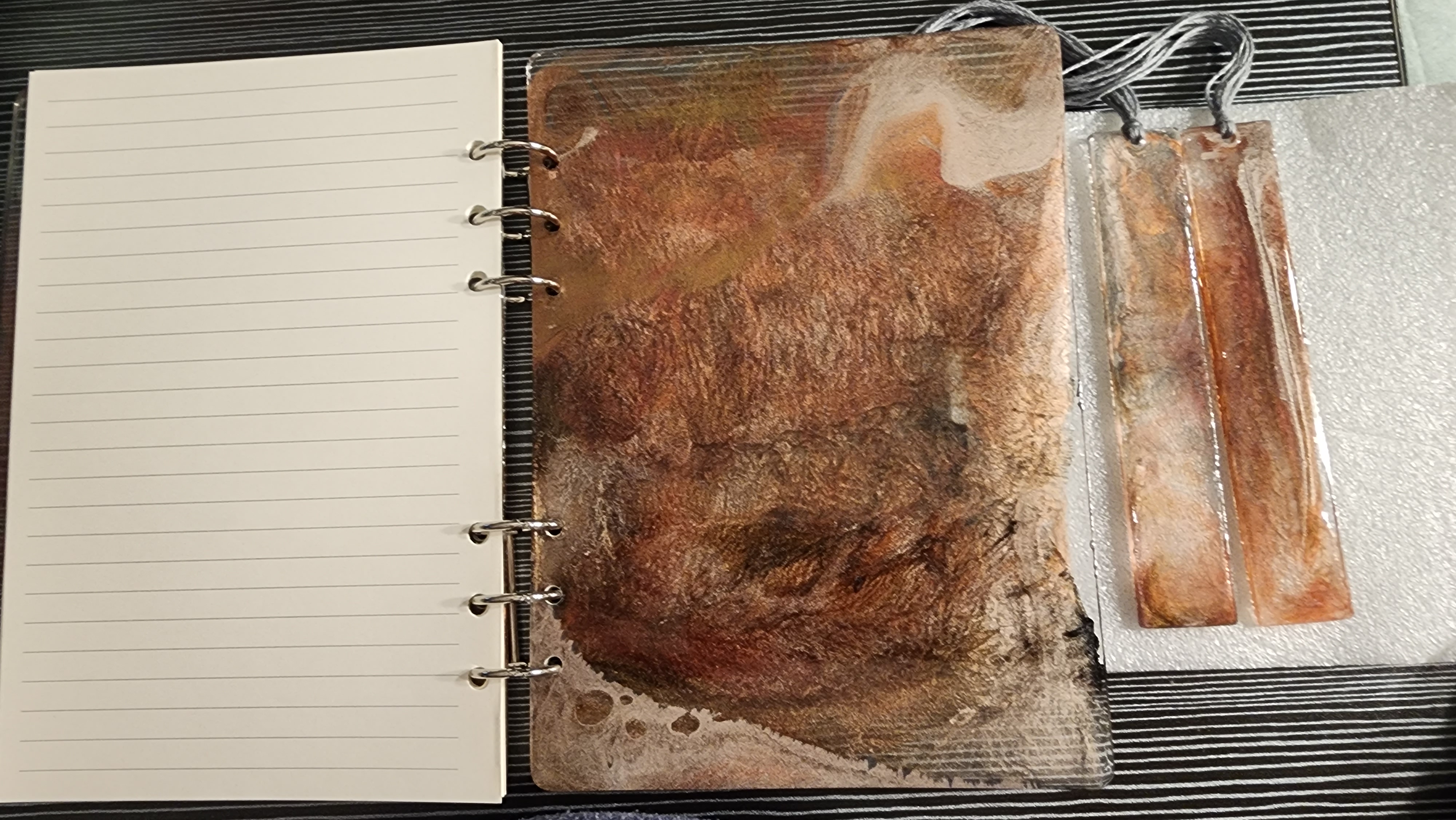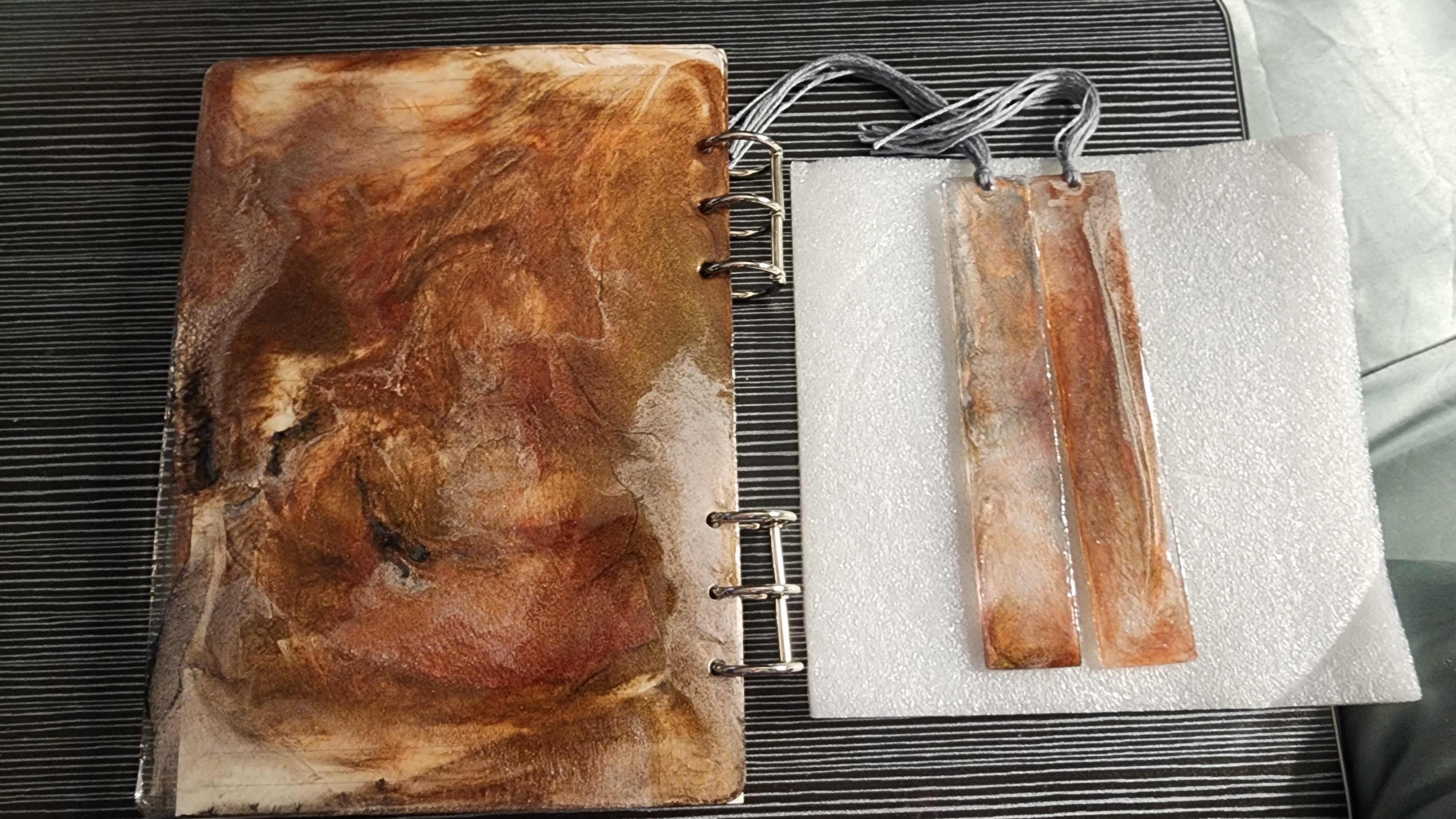 Resin notebook with 2 matching bookmarks. Notebook is approximately 6x8 and uses A5 size paper that can be refilled. Marbled colors of red, silver, gold, and gray. Front has 4 charms, an elephant, music note, sun, and stethoscope. Handmade and sold as is. Pictured with a 20 oz soda bottle for scale.