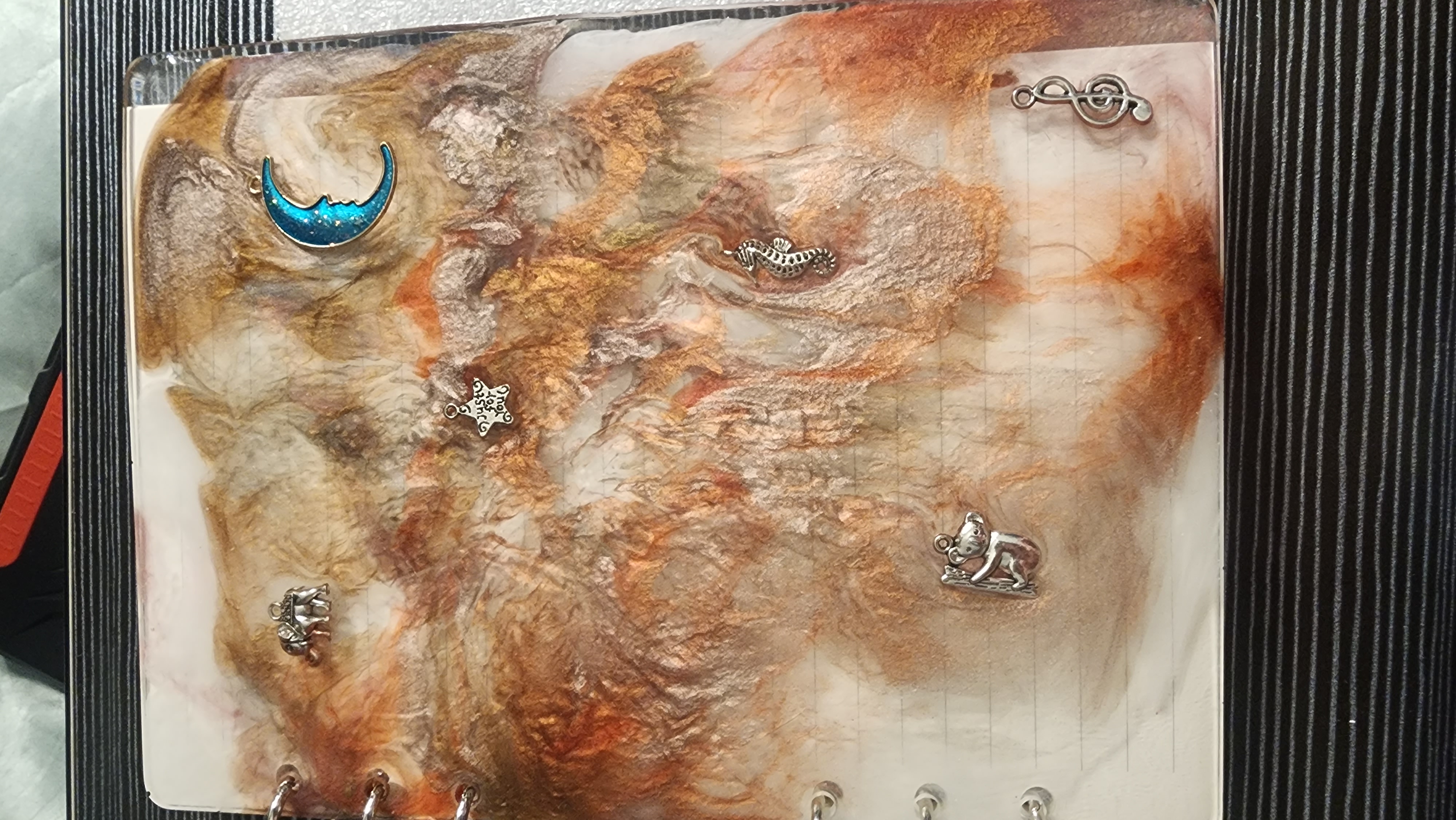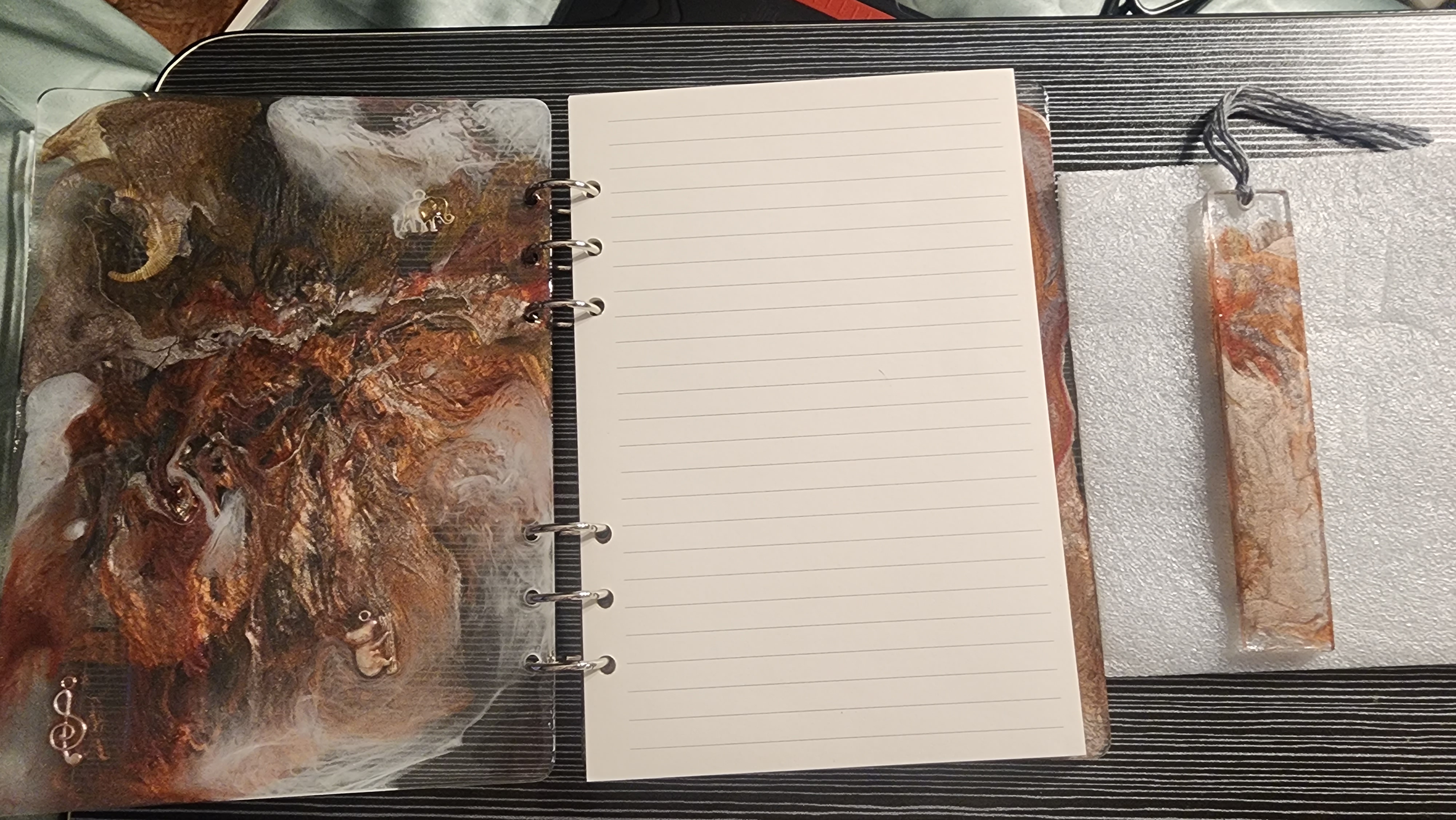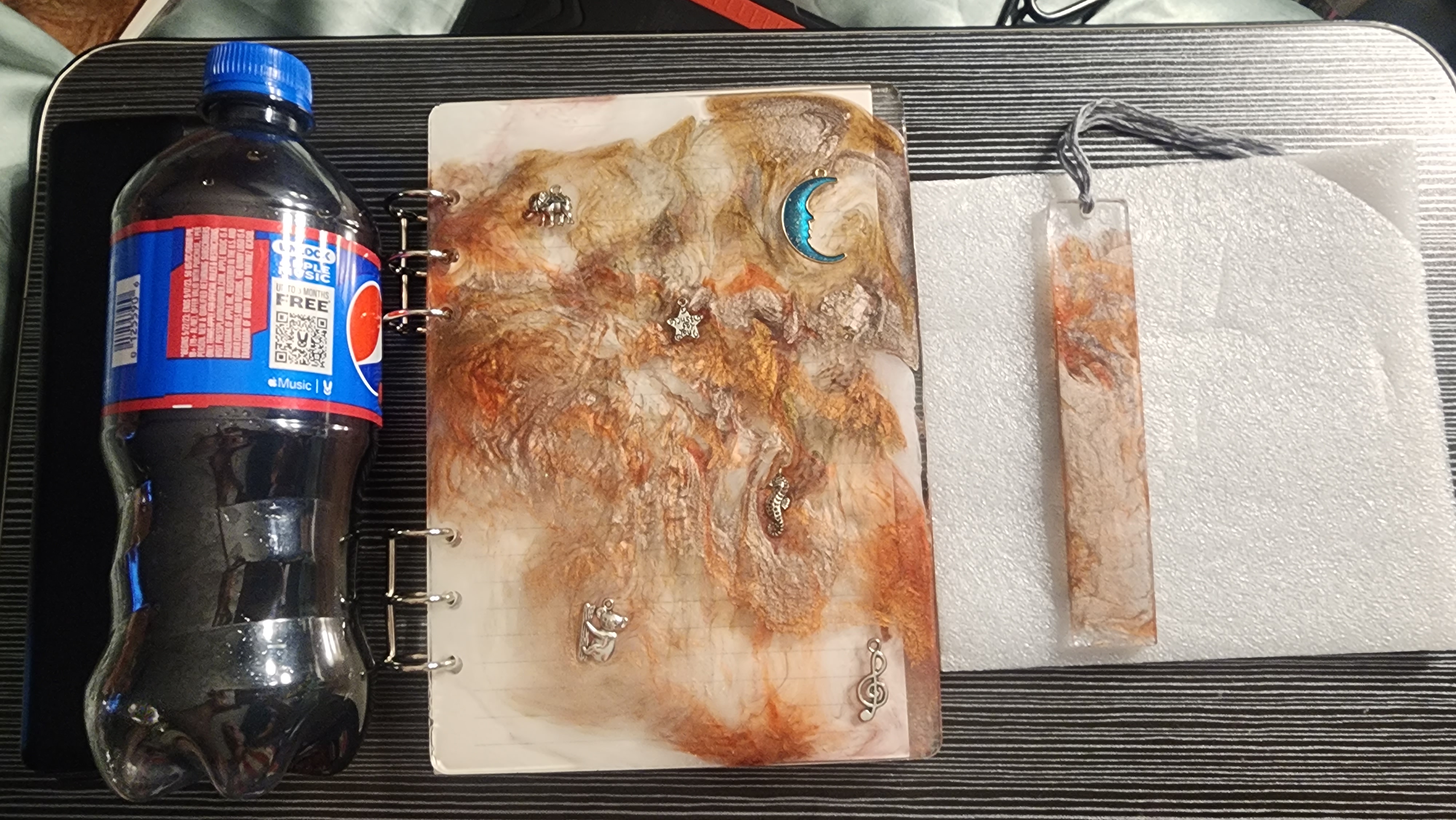 Resin notebook with matching bookmark. Notebook is approximately 6x8 and uses A5 size paper that can be refilled. Marbled colors of red, silver, gold, and gray. Front has 6 charms, an elephant, music note, a star, a koala, a moon, and a seahorse. Handmade and sold as is. Pictured with a 20 oz soda bottle for scale.