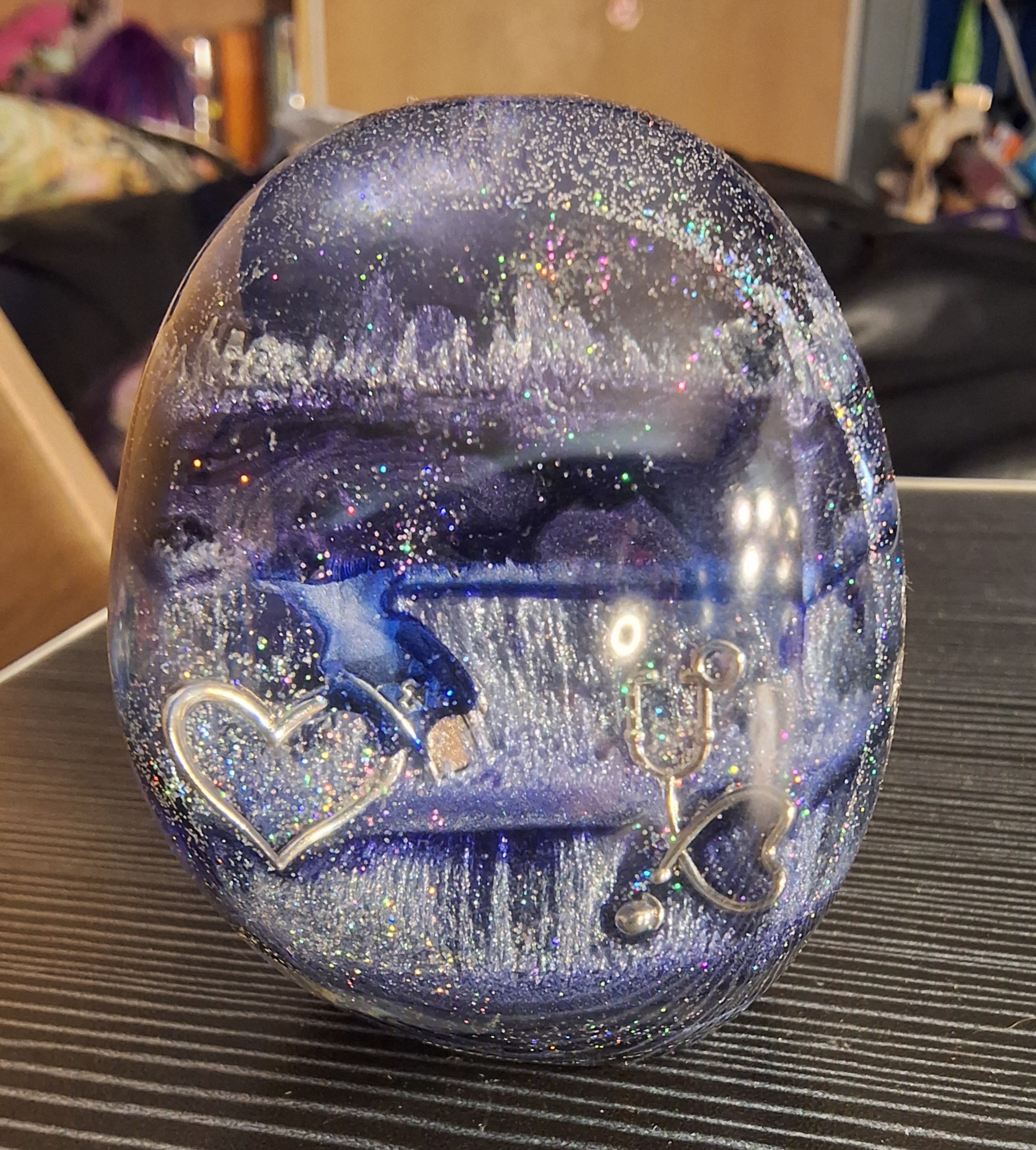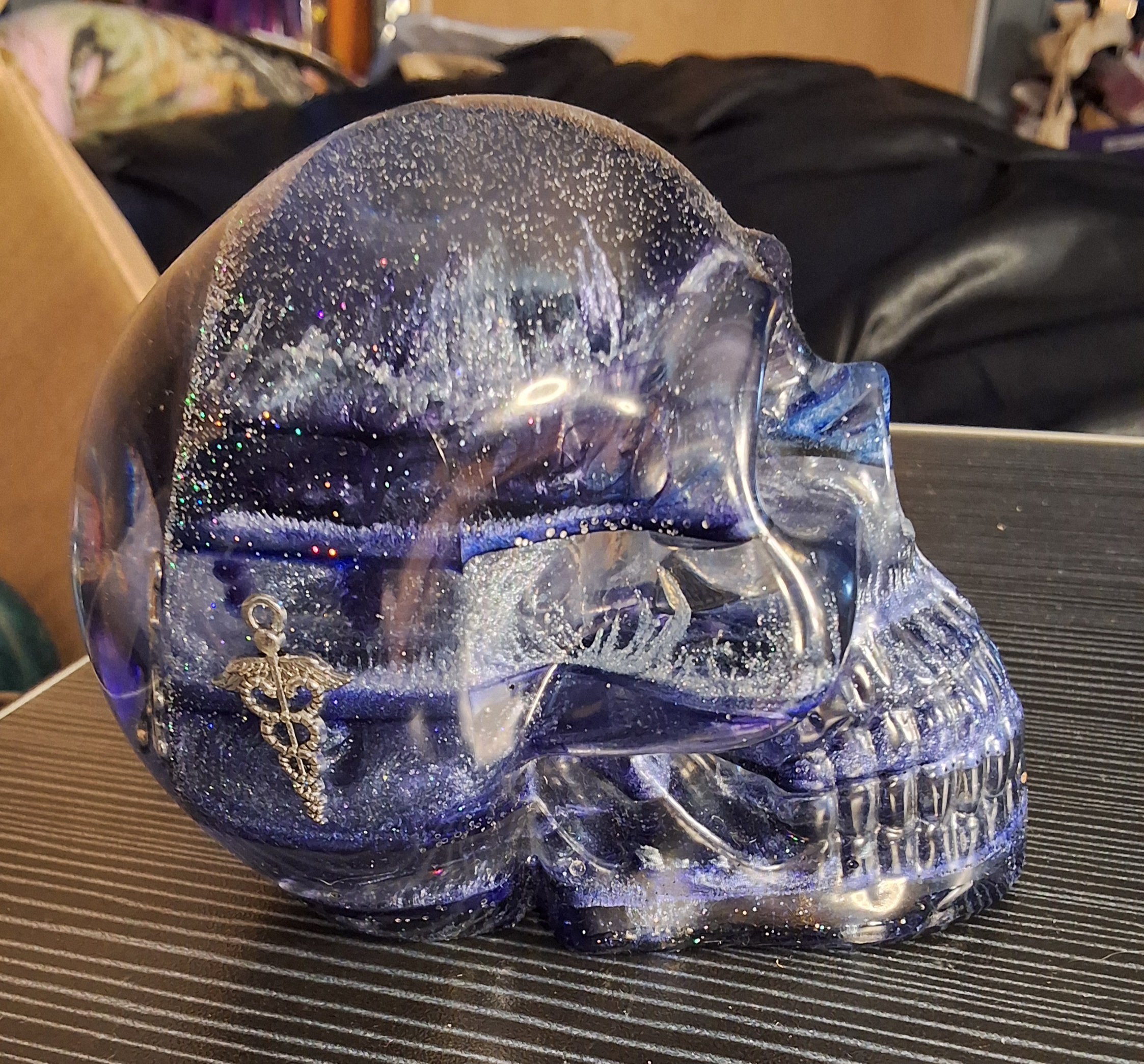 Purple sparkly resin skull with nursing themed charms. Great gift for anyone in the nursing fields. Item is hand made and sold as is.