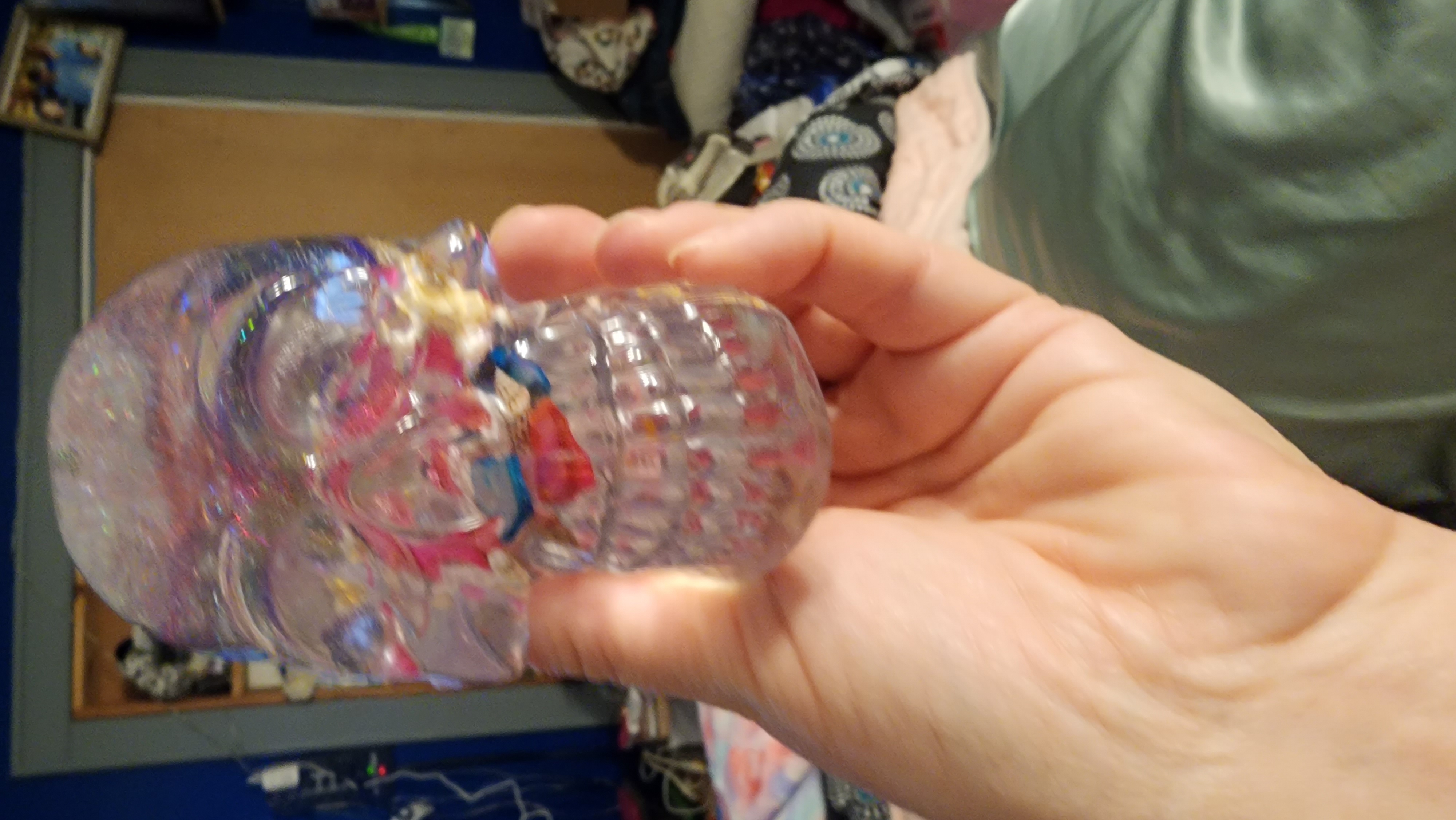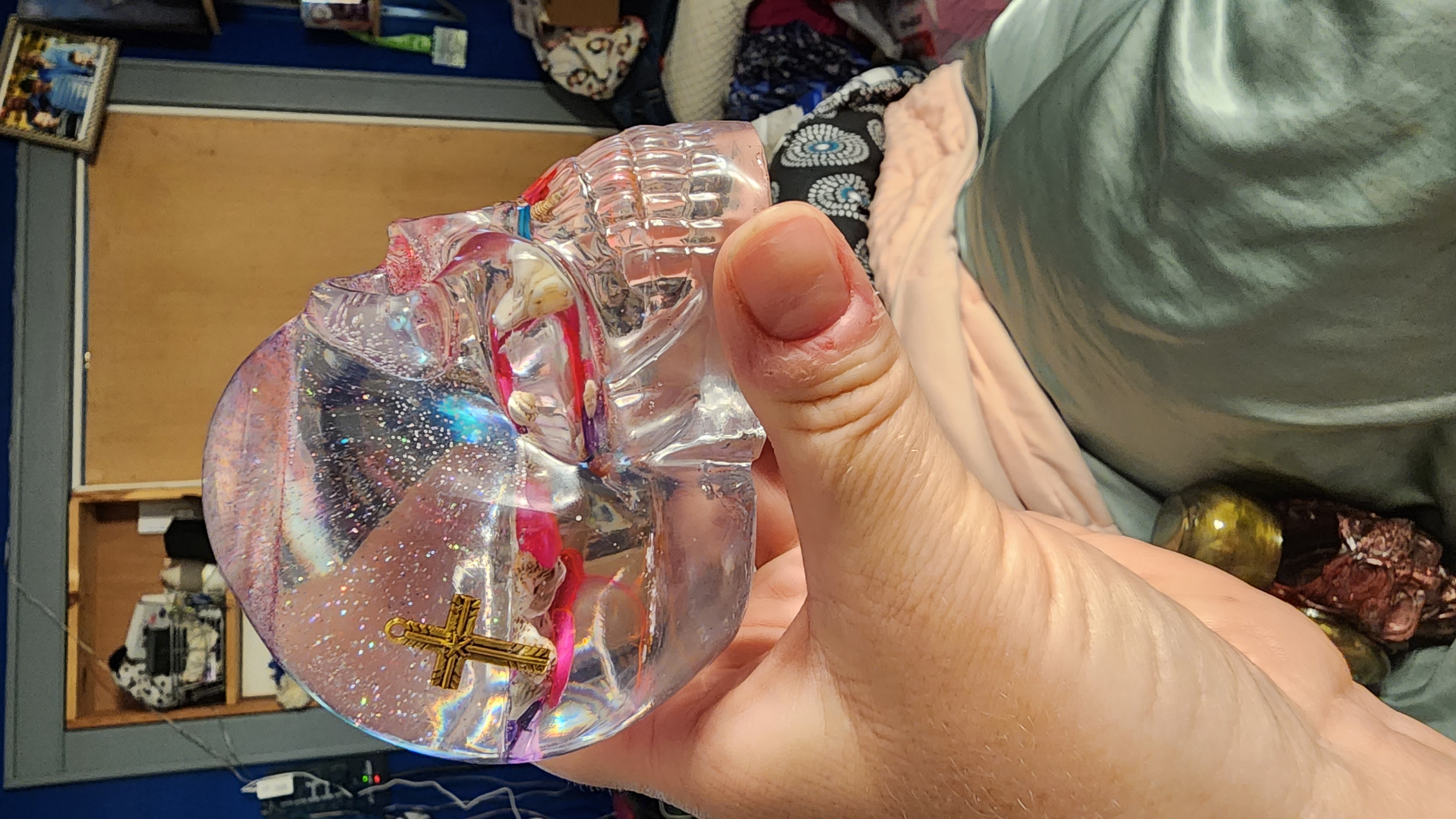 Clear resin skull with sparkles, crosses, and seashells. Great gift for anyone that loves skulls. Hand-made and sold as is.
