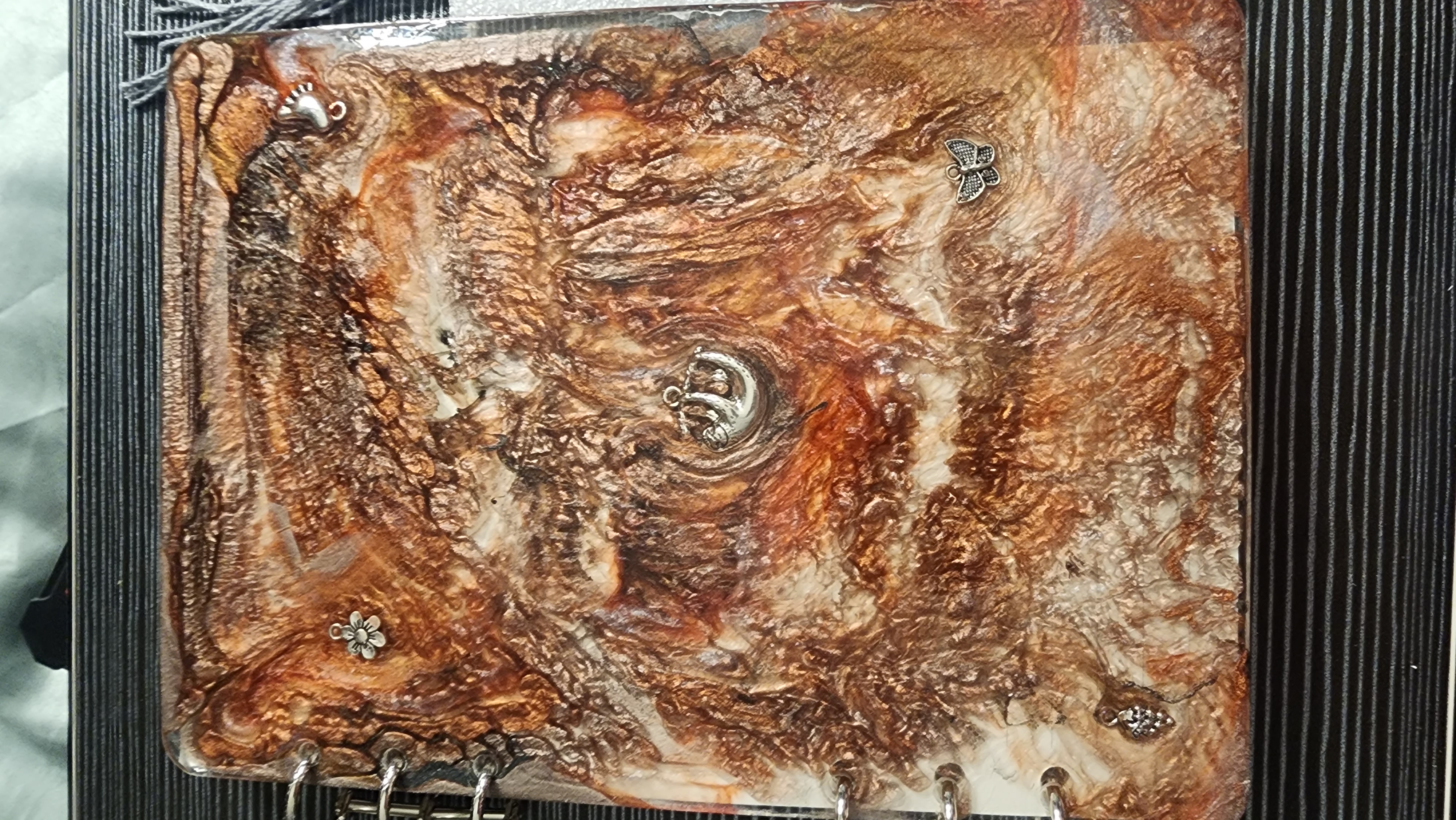 Resin notebook with matching bookmark. Notebook is approximately 6x8 and uses A5 size paper that can be refilled. Marbled colors of red, silver, gold, and gray. Front has 5 charms, a flower, a foot, grapes, a butterfly, and a sloth. The back also has 5 charms, a music instrument, a swan. A globe, a star, and a stethoscope with a heartbeat and heart. Handmade and sold as is. Pictured with a 20 oz soda bottle for scale.