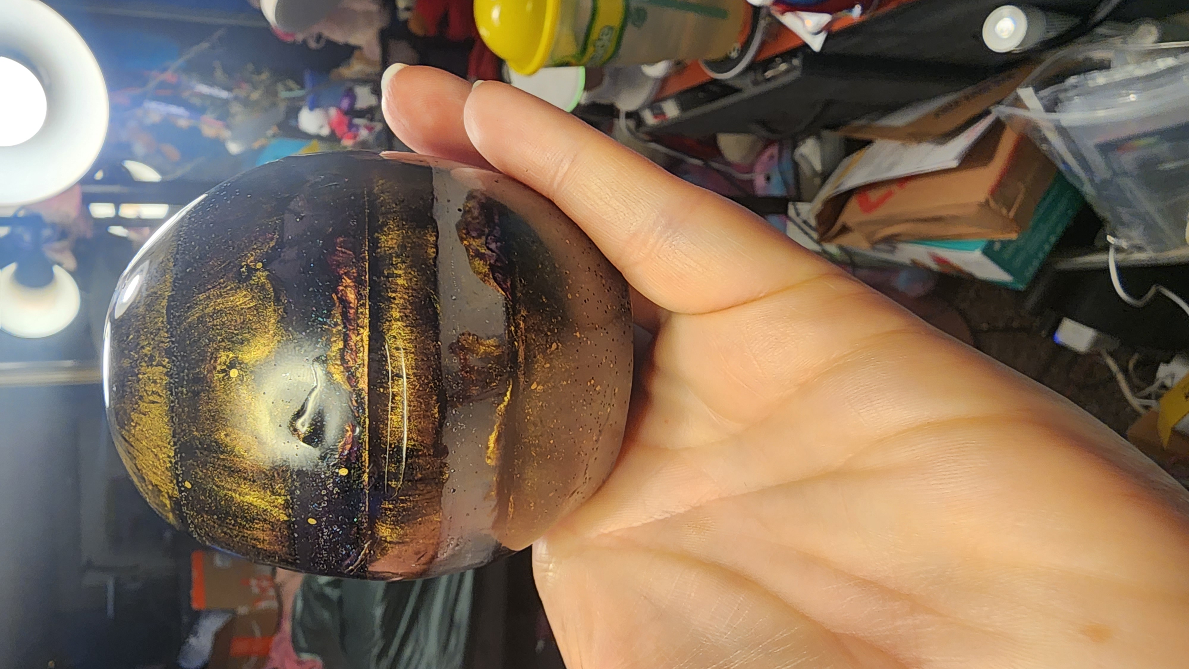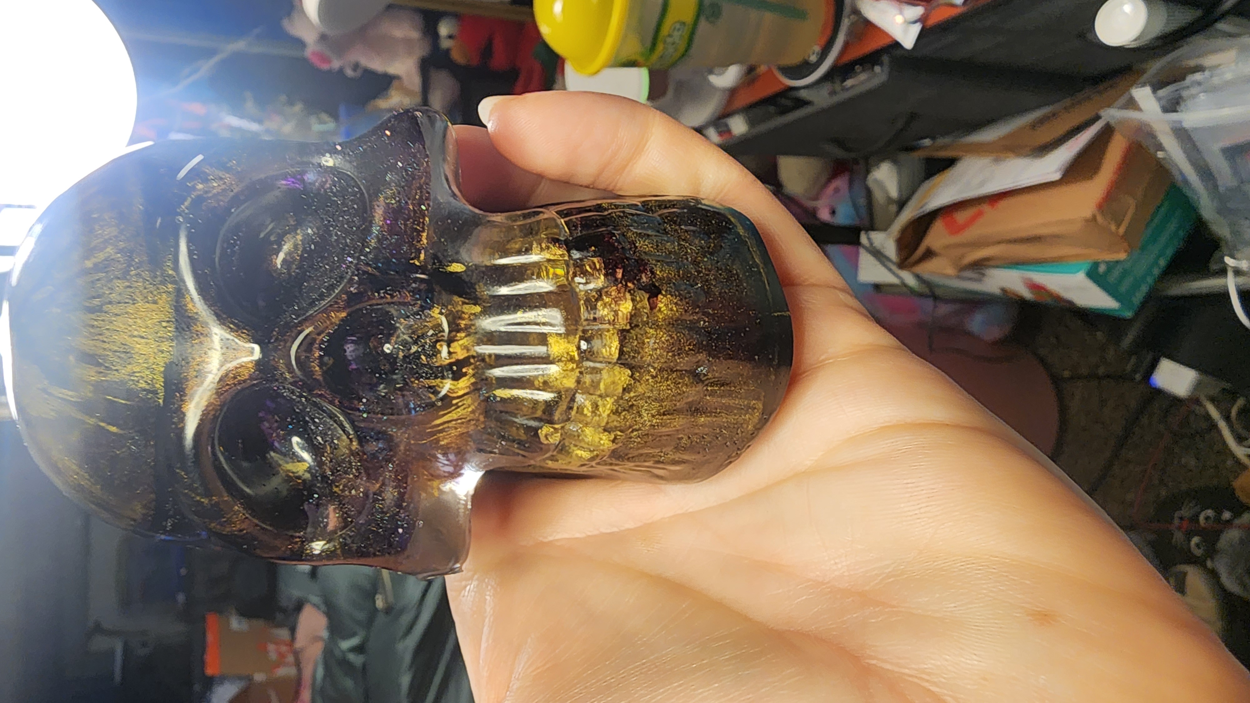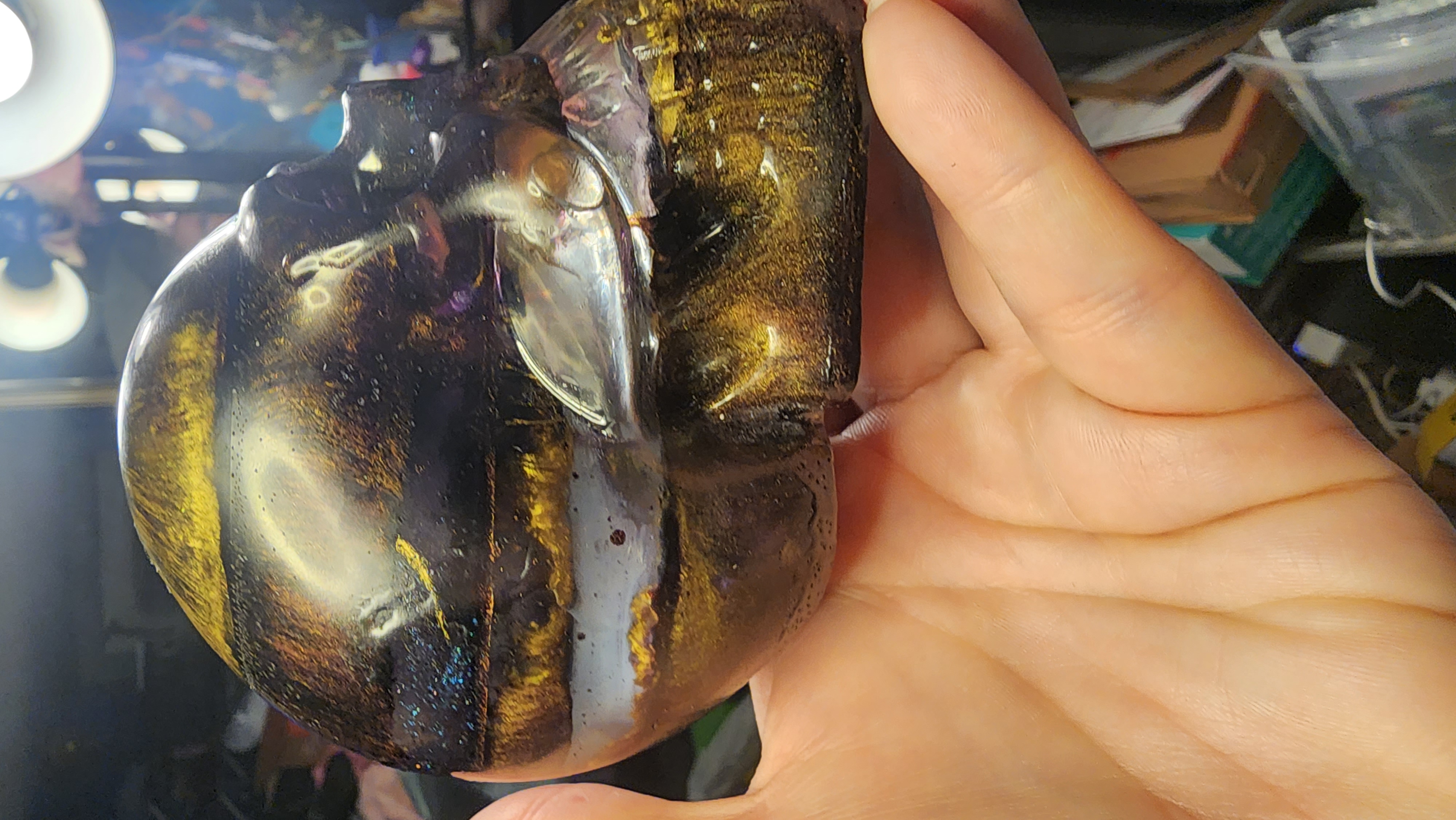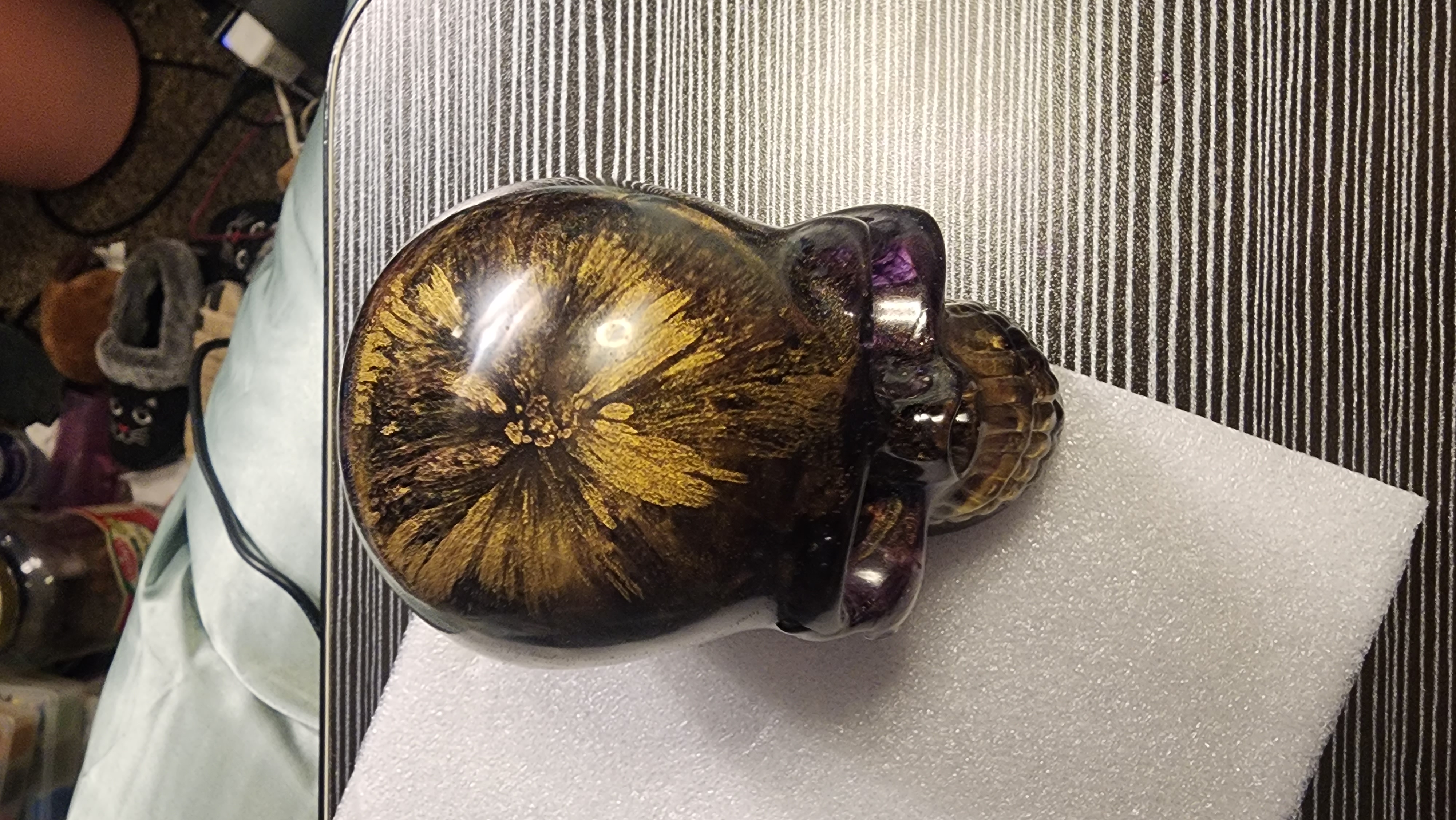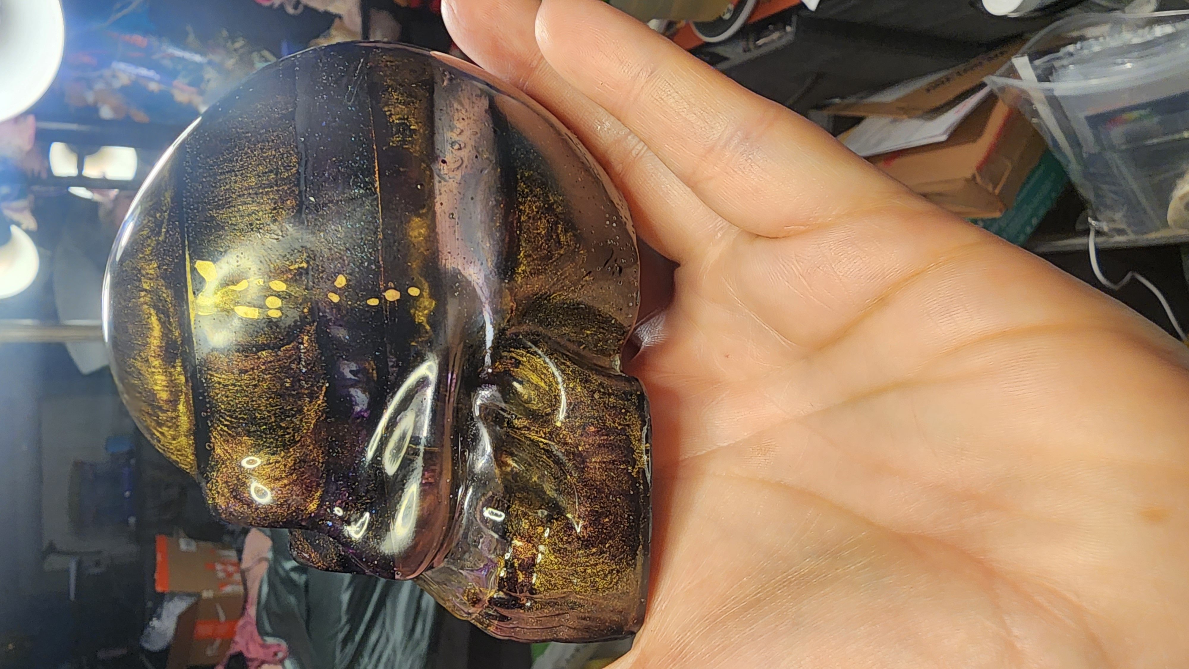 Handmade resin skull. Layers of purple and metallic gold. Very interesting looking and a great gift for skull lovers. Pictured with a 20 oz soda bottle for scale. Sold as is.